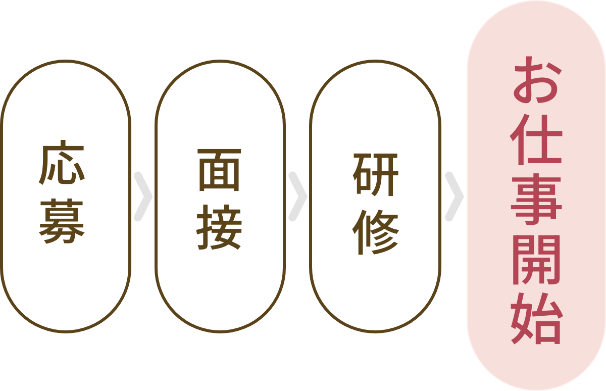 選考は、フォームでのエントリー、オンラインまたは対面での面接という流れで進みます。採用後は所定の研修を修了次第、お仕事を開始していただきます。選考の各ステップでご案内いたしますので、安心してご応募ください。
