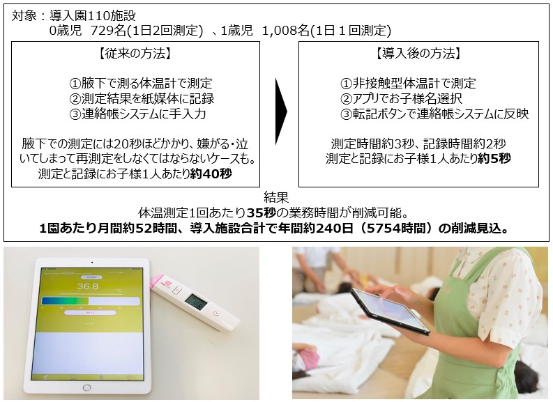 株式会社ポピンズ(東京都渋谷区、代表取締役社長:轟 麻衣子)では、 従来より「安い、きつい、長い」などと言われてきた保育士の処遇改善に向け、DXを通じ解決に取り組んでまいりました。このたび、コロナ禍により従来よりも体温測定の重要性が増した現状を踏まえ、DXを取り入れることでスタッフの軽減を構想。1月より自社開発アプリ「ポピンズメモリー」にシステム連携させ、株式会社hugmoの「hugsafetyスマート検温サービス」の導入を開始した結果、導入した110のポピンズのナーサリーにて年間約240日分(5754時間)もの業務削減が見込まれることが分かりました。