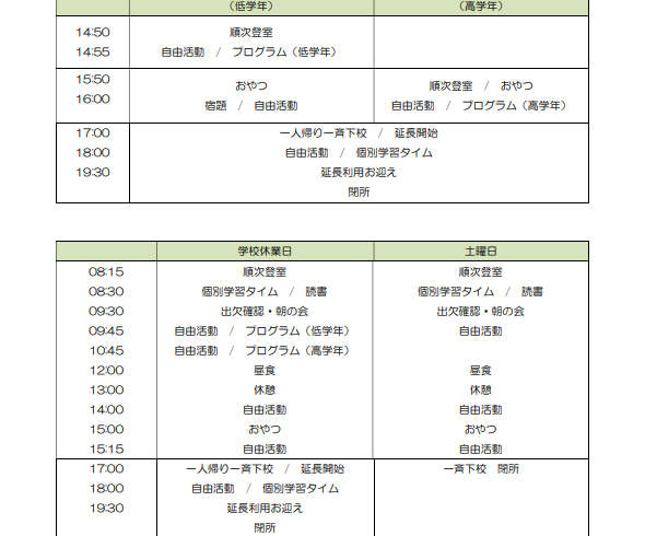 | 基本時間 | 小学校授業日:月曜~金曜 放課後~17:00 小学校休業日:月曜~金曜 08:15~17:00 土曜日:08:15~17:00 |