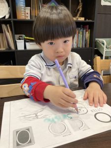 文字を書く前に、お子様たちは正しい三点持ち✏️(親指・人差し指・中指)を意識しながら、線なぞりの練習を行います。