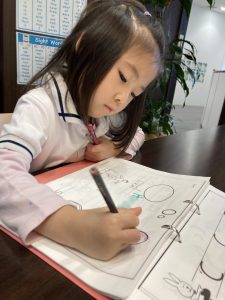 現在では、多くのお子様たちが自分のフルネームを自立して書けるようになり、文字間を意識しながらきれいに単語を書き写せるようになっています。