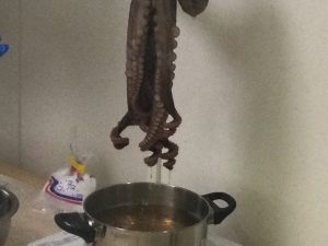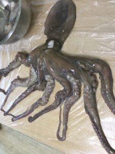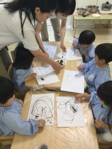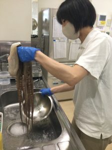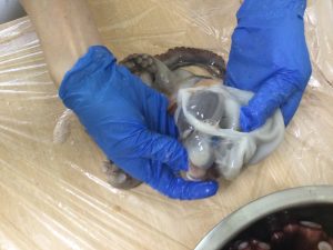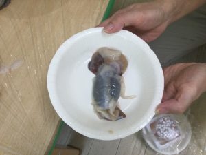先生が体の中から「墨袋」を取り出して中身を出しました。