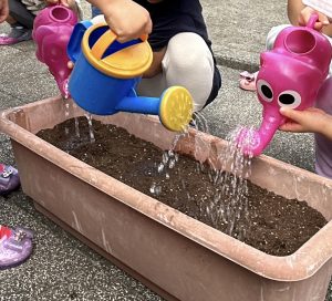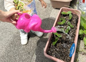 野菜の成長には、太陽の光とお水が必要になってくる為、お子様たちに水やりの活動でお世話を行ってもらいます。