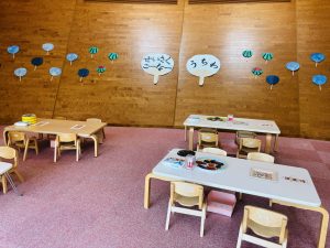 栄養士が作成した壁面が飾られたダイニング(食事処)で