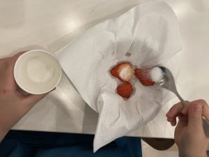 10分経ったら、キッチンペーパーでいちごの水分を拭き取って生地の上へ。