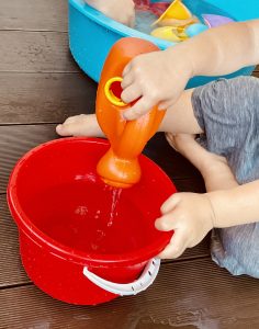 じょうろを使って水をバケツに移したり、
