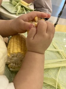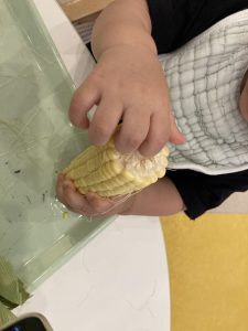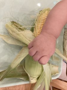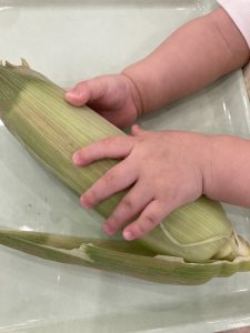 0歳児クラスにてとうもろこしに触れる食育活動を行いました。