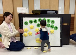 『こんこんくしゃん』の歌で、お子様が講師のくしゃみの真似をして