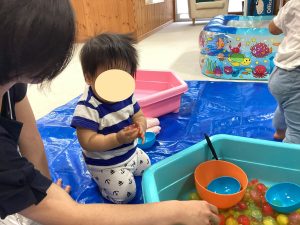 昨日、8月18日(月)のおひさまクラスは氷に触れて感触遊びをしました!✨