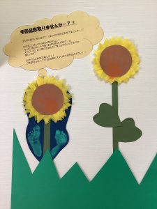 さて、ポピンズキッズひろば上原では、先週おひさまクラス(0歳児クラス)で作成したひまわりを飾りました!!
