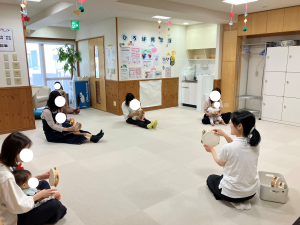 保護者様のお膝の上で静かに集中して聴く姿がありました。