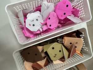 どちらのチームも遊びに来てくれるお友だちみんなのために、たくさんの折り紙を折って、景品を作っていきました。