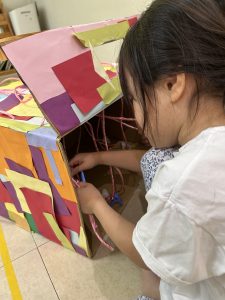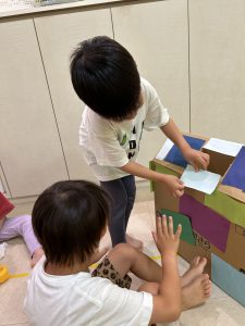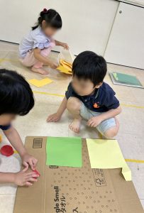 お友だち同士で協力をして、段ボールに画用紙を貼っていったり…