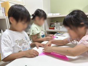 4歳児のお子様が折り方に困ったときには、「どうやるの?」と声をかけて、5歳児のお友だちに手伝ってもらう様子もあり、異年齢での合同活動ならではの光景もたくさん見られました✨