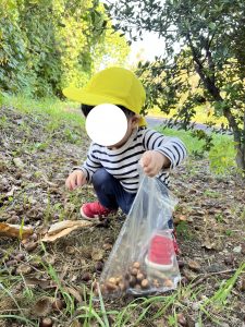 「それ、見せて」とどんぐり帽子を被ったどんぐりを