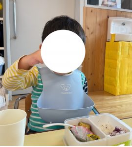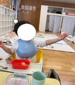 「みて、美味しいよ」とおにぎりを保育士に見せてくれました!