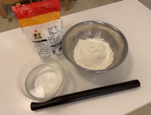 ボールに小麦粉と水を入れて力を込めてこねました。