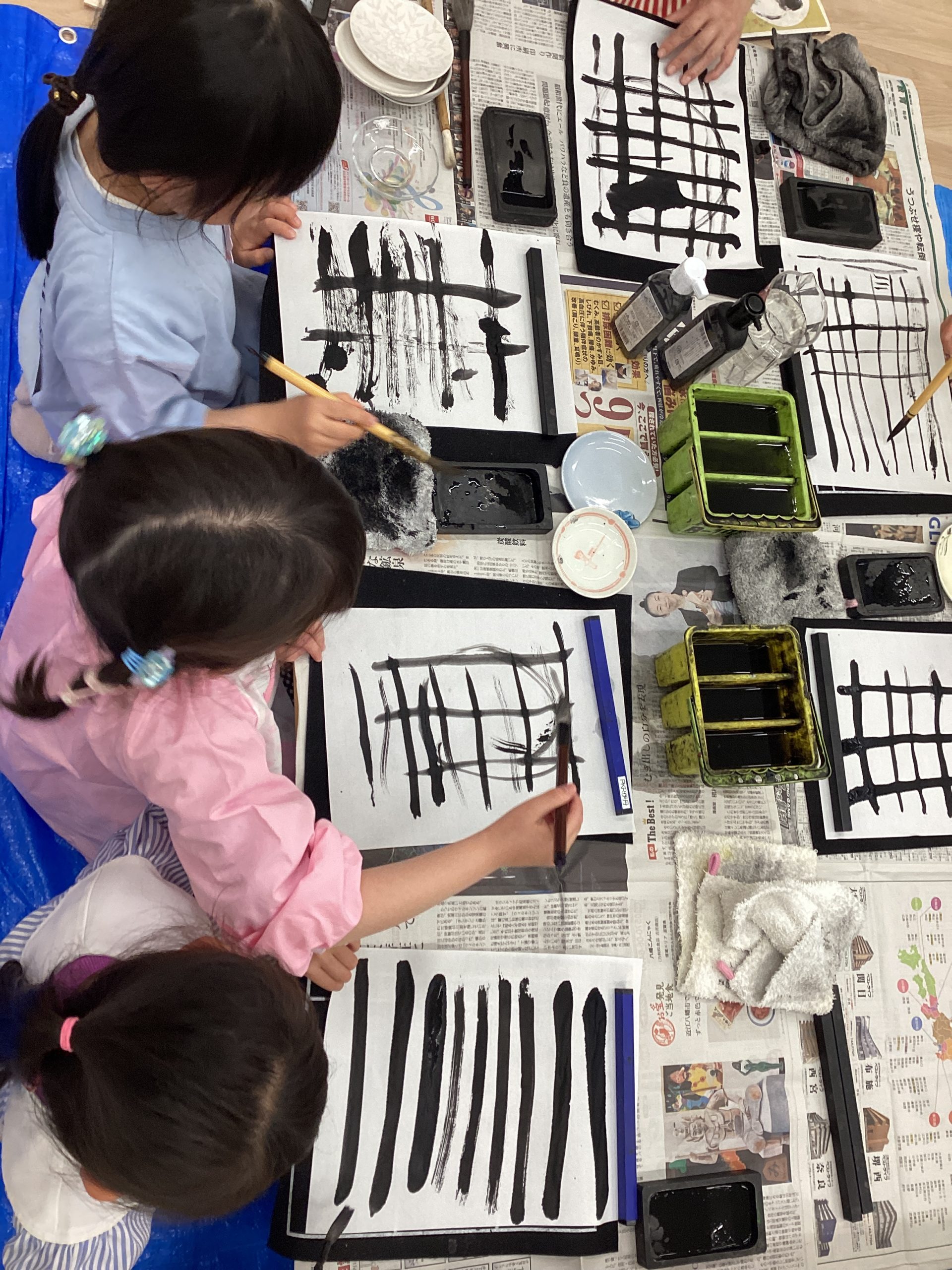 書道で墨には慣れているお子様も、墨絵は初めての体験。