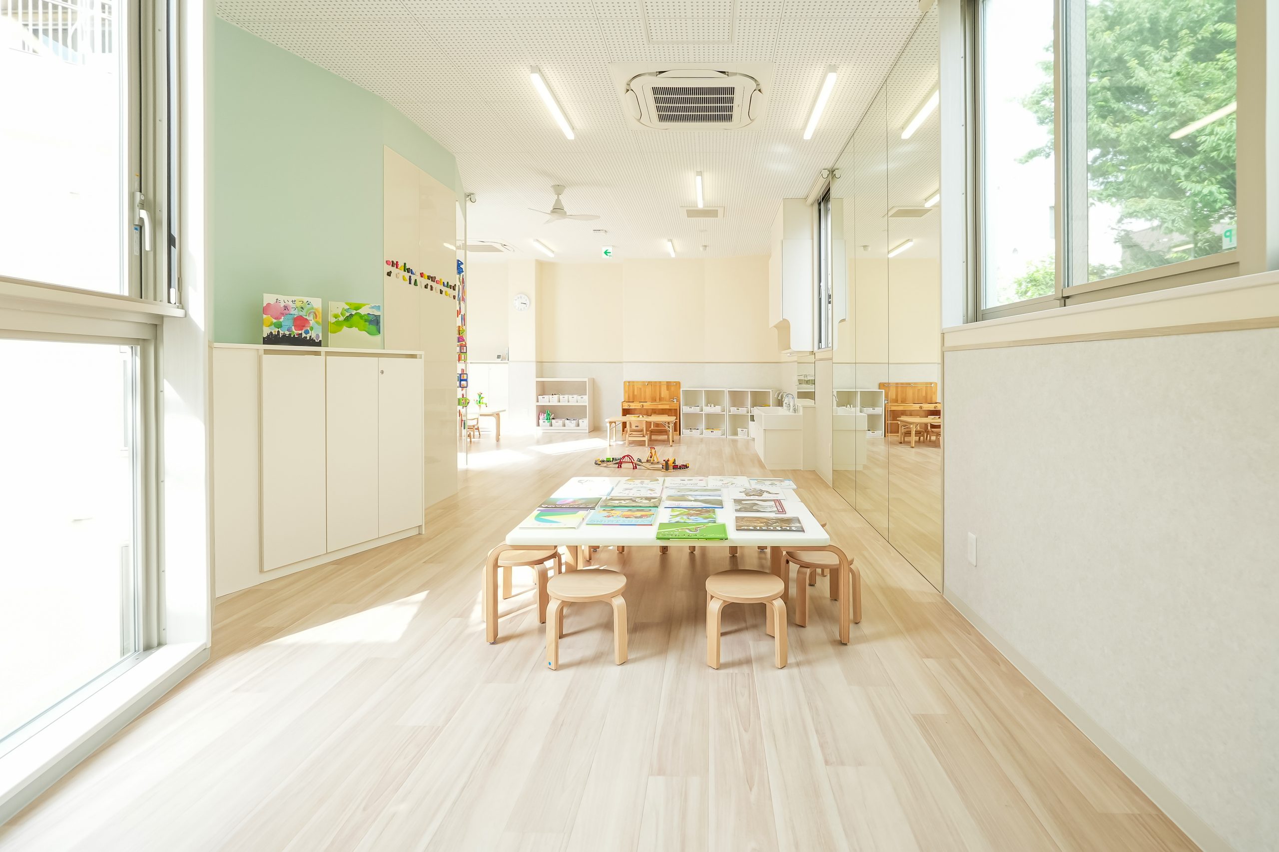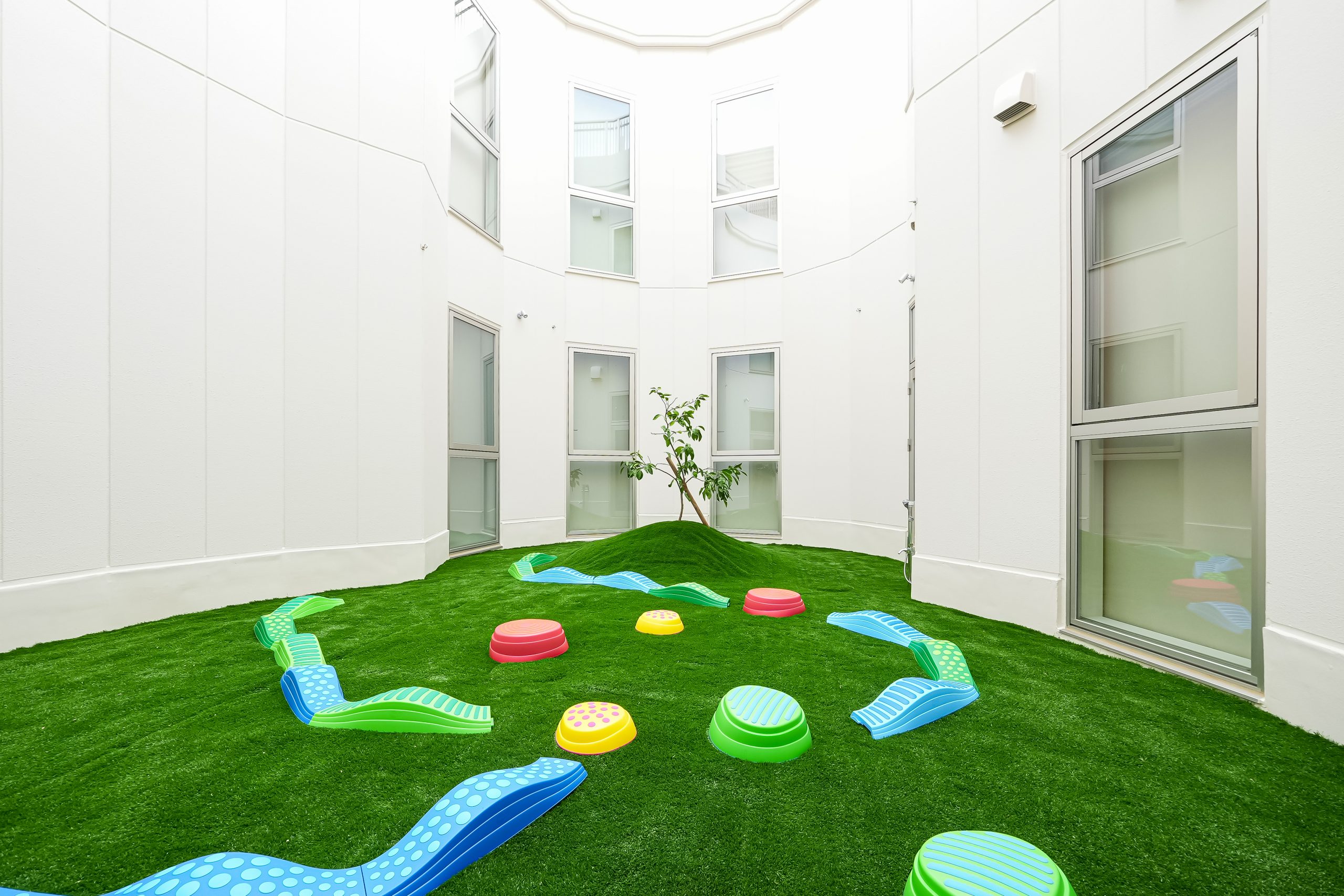 明るく開放的な空間でお子様の健やかな成長をサポートしていきま す。光と風をふんだんに取り込む中庭と吹き抜けを備え、 お子様がのびのびと遊べる空間がございます。また、安全にも十分に配慮し、 季節の変化を肌で感じられる快適な環境の中で、 毎日笑顔で過ごせるようにしていきます。