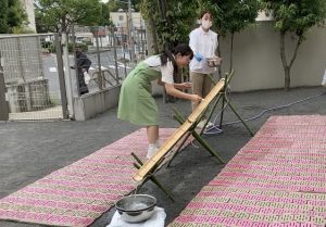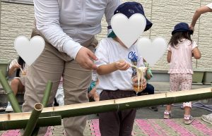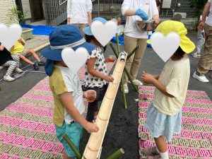 園庭に登場した、長く連なった青々とした竹の流し台に、