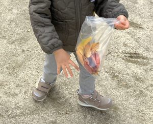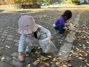嬉しそうに落ち葉拾いを楽しむお子様たち。