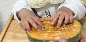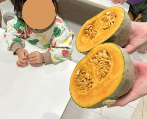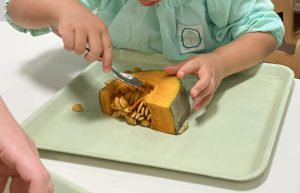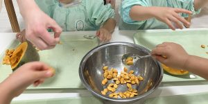 1・2歳児クラスのお子様は、かぼちゃのタネ取りに