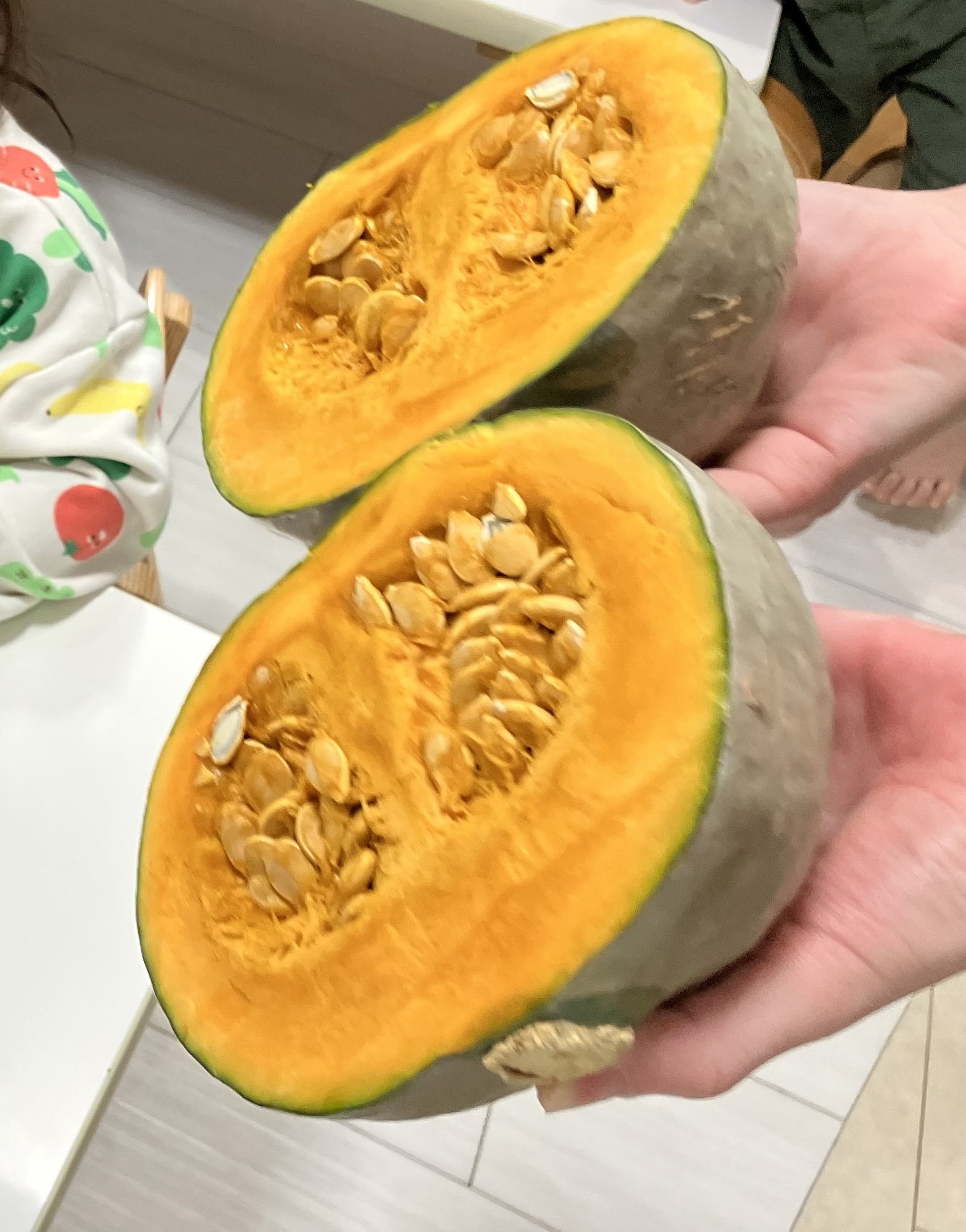 1・2歳児クラスのお子様は、かぼちゃのタネ取りに