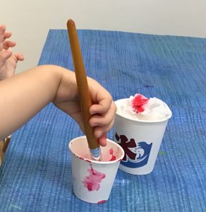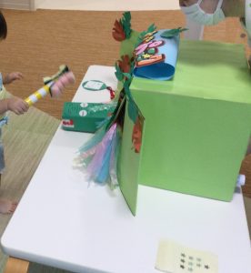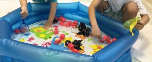 「あれ?きんぎょさん にげちゃうねー、がんばって!」