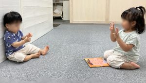 2歳児さんの手遊びを真似て、0歳児さんは同じように手を動かします。
