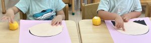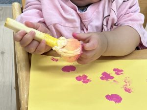1歳児クラスは、持ちやすい様々な形のスタンプを用意し、