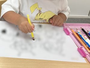 2歳児クラスは筆を使って自由に描いたり、色塗りをしたり。