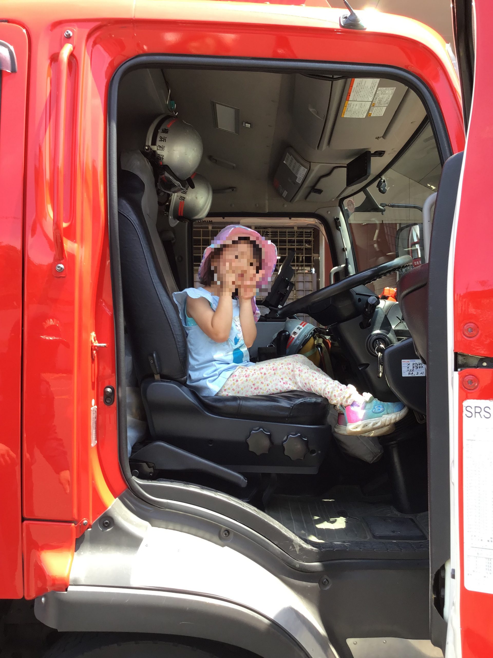 消防車の運転席に乗せてもらってハイ、ポーズ😊
