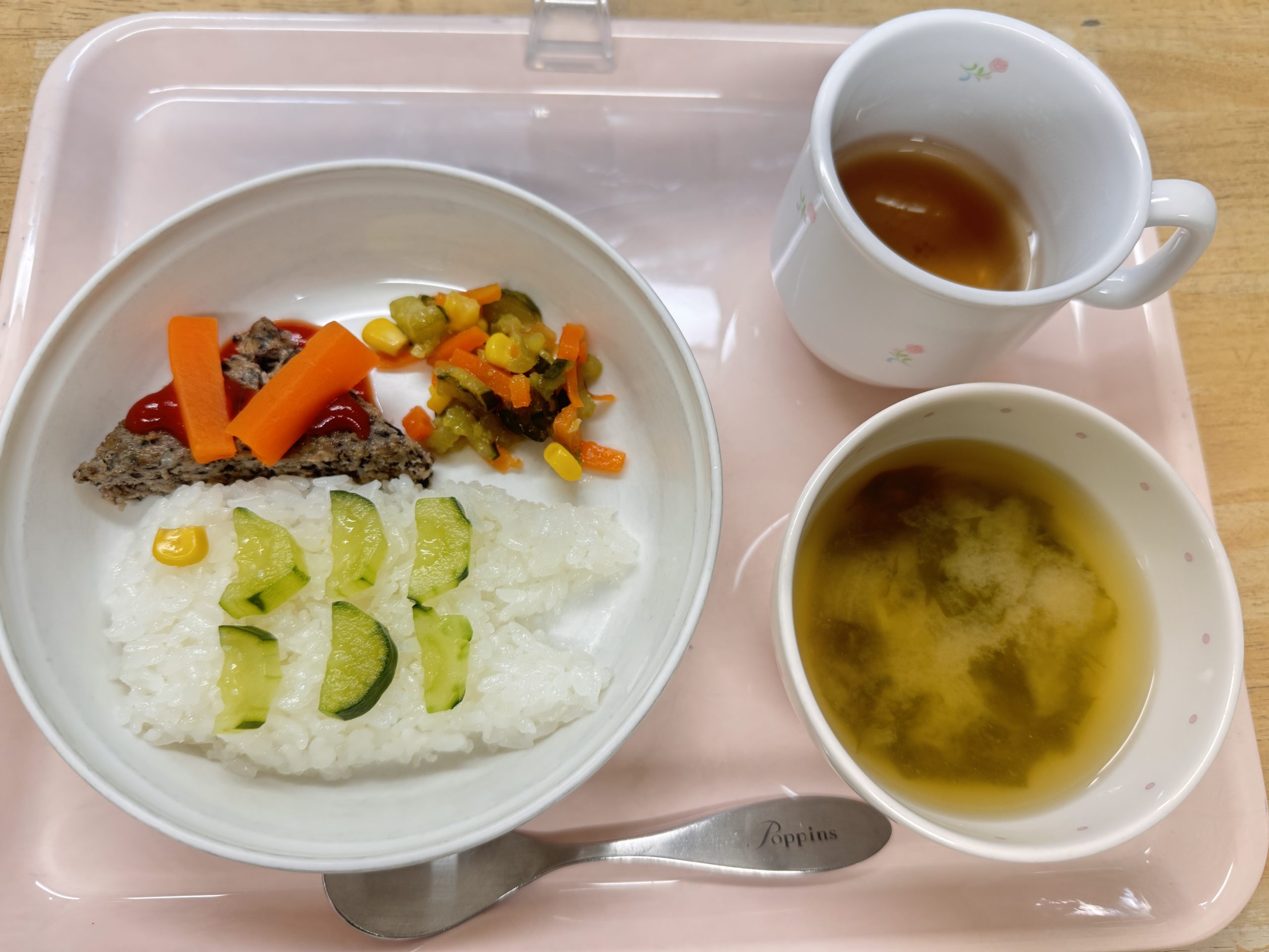 こいのぼり型に盛り付けたごはんと、兜型に焼き上げたハンバーグが、お子様たちの食欲を視覚・嗅覚からも刺激しています♪