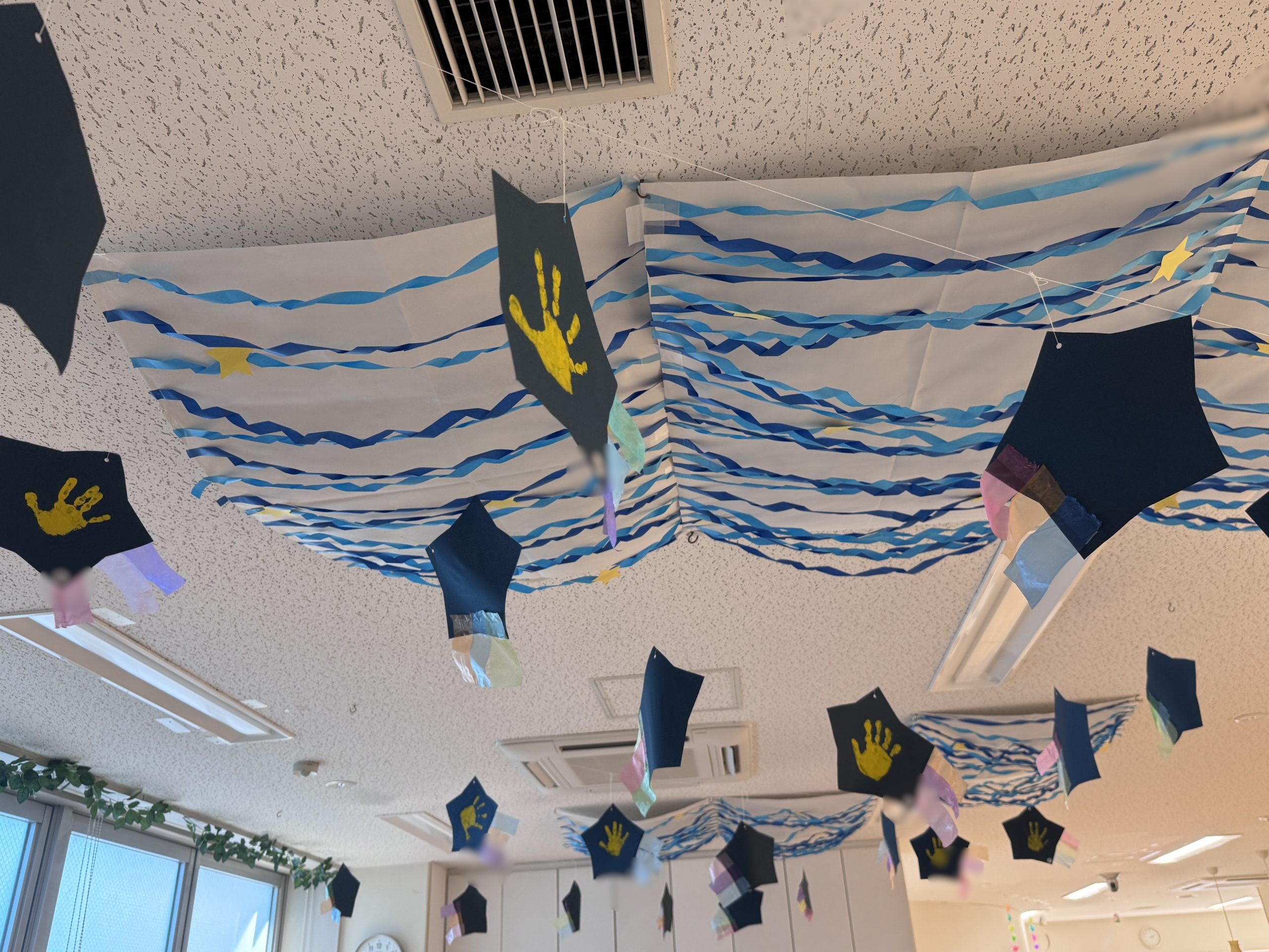 皆が集まるお部屋の天井装飾も、手形のお星さまがきらめいています。