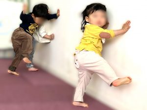 片足立ちが難しいお子様は壁に手をつくことで