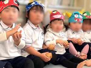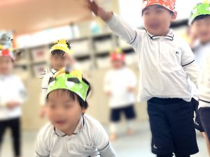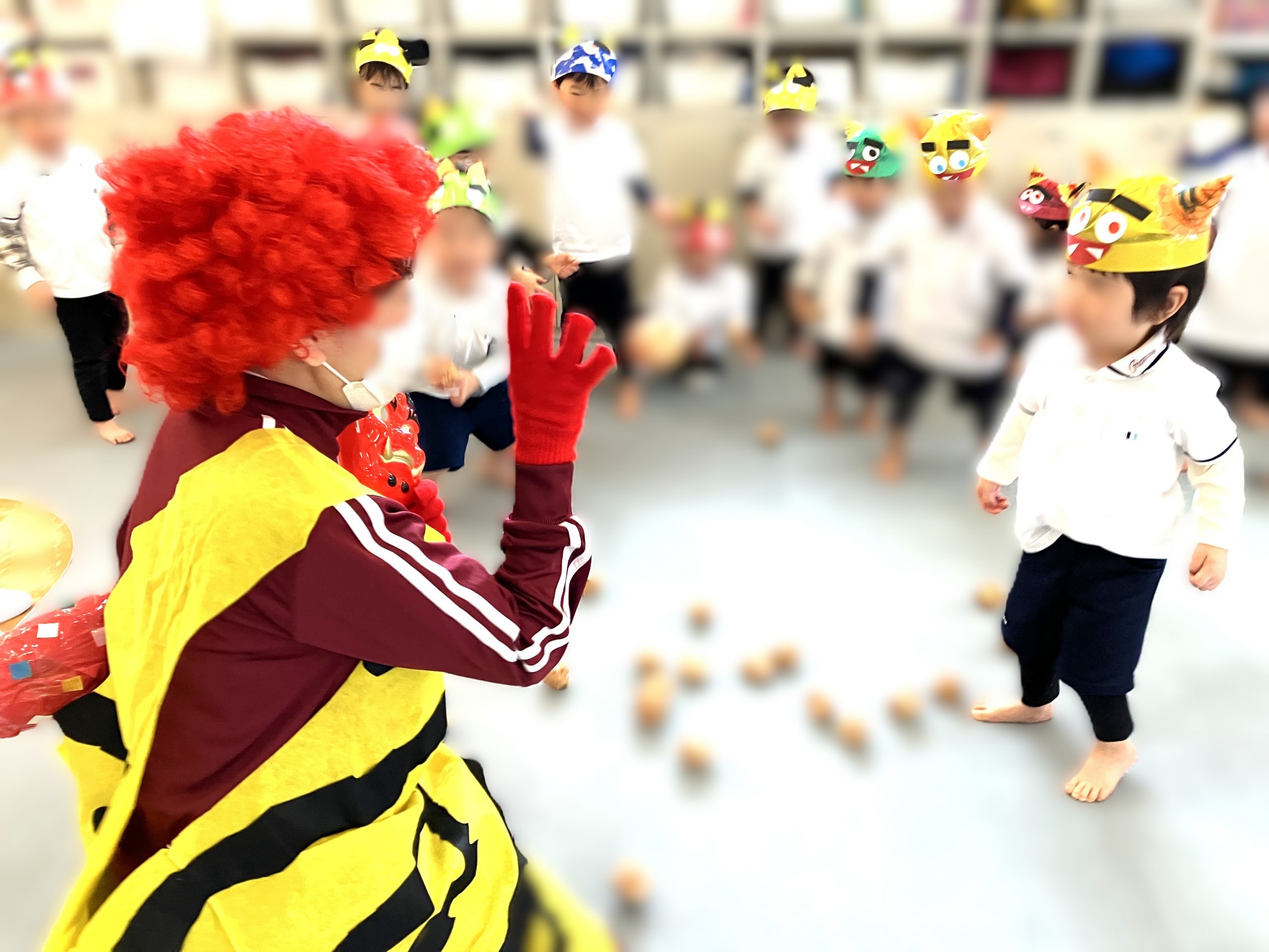 1月の歌で「豆まき」を歌ったり、鬼のお面製作をしたりして、お子様たちは2月3日の節分を心待ちにしていました。