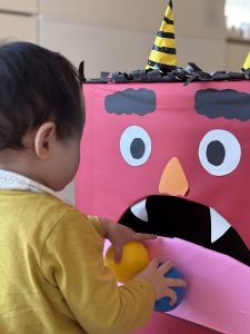 段ボールで作った鬼をめがけてボールを投げました。