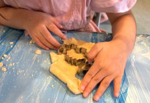 それを平らに伸ばして、恐竜やお花、蝶など好きな形の型で型抜きをしました。