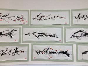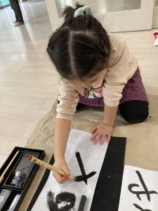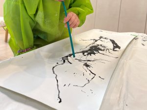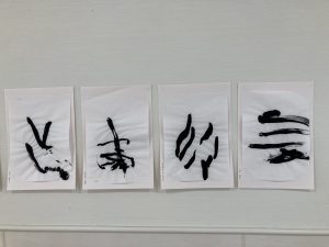 0歳児から5歳児までのお子さま全員、 筆を持って半紙に思い思い書きました。