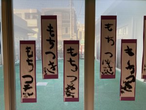 4歳児は、「もちつき」と書く字を決めて書きました。