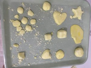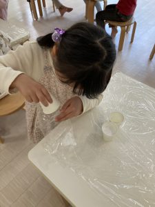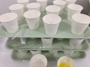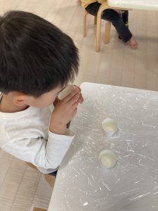 そして、重曹・コーンスターチ・クエン酸をそれぞれ入れた紙コップをお子さまたちに配り、