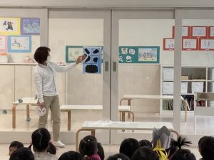 冷蔵庫の中から色々な食べ物が出てくるので、 その食べ物を当てながら歌を歌っていたお子さまたち。