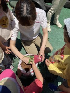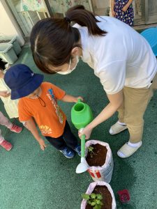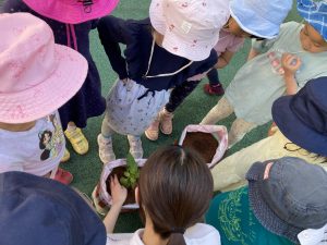 今回は4、5歳児が担当となって 栄養士の話を聞きながら一人ずつ土に触り、 苗を植えていきました。