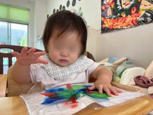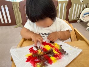 絵の具をのせた画用紙を ビニール袋の中に入れ、 上からペタペタ触ってみます!! その感触を楽しんでいました。