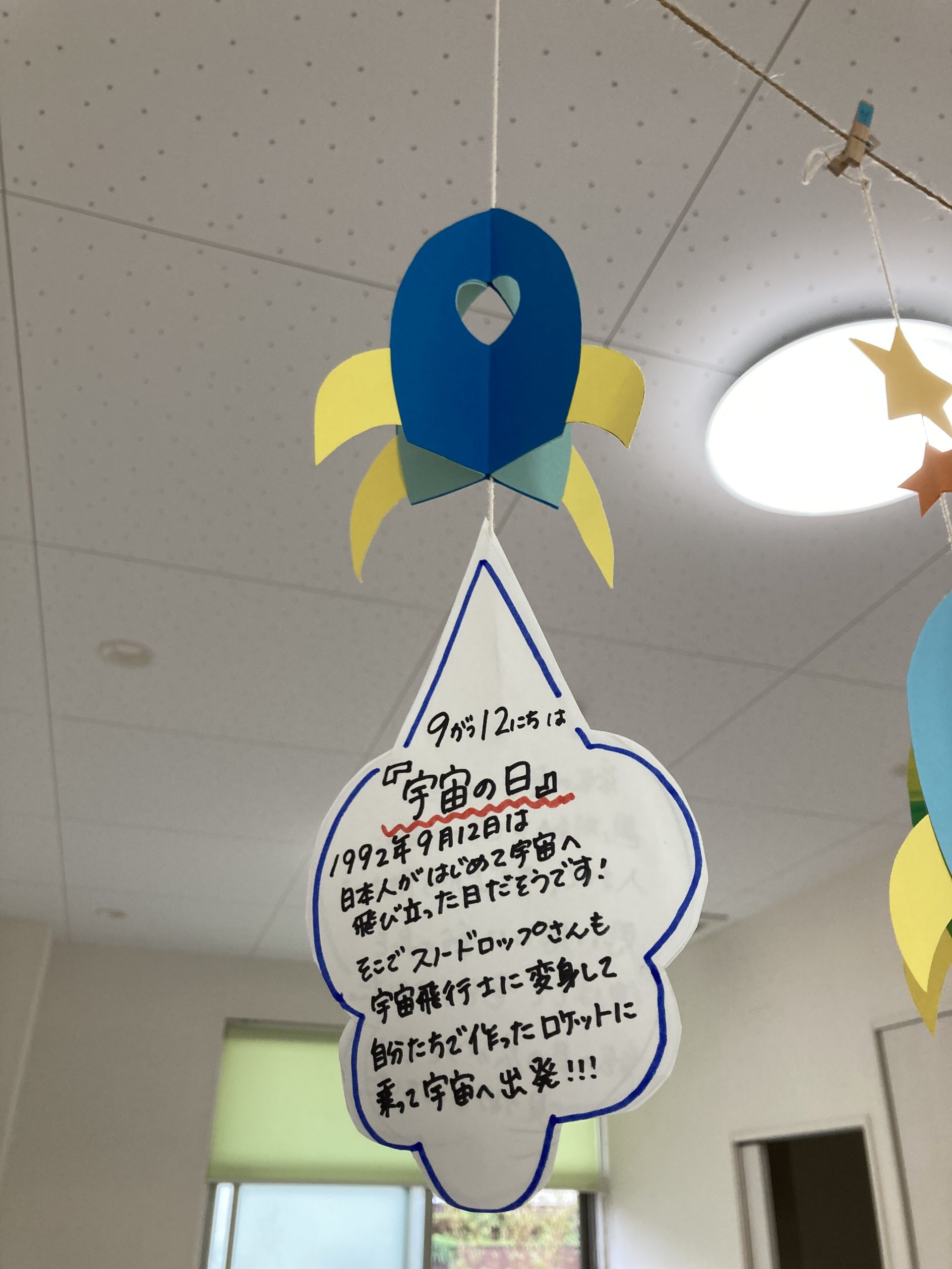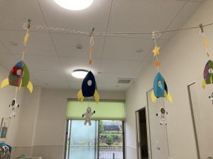 完成したロケットを飾り付けると… 保育室の天井に飛んでいる 可愛らしい姿がありました。