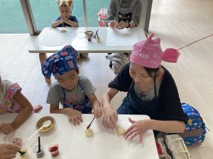 ホットケーキミックス粉と絹ごし豆腐を混ぜて丸めたものを配り、
