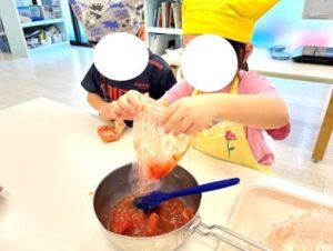 収穫したトマト・パプリカで何を作りたいかみんなで話し合い、