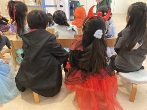 まずはハロウィンの由来や意味を学ぶ時間。 そして、自慢の衣装を披露するファッションショーで会場は大盛り上がり!