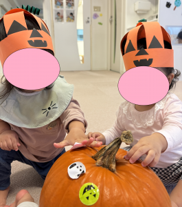 0歳児はカボチャの観察とシール貼り、
