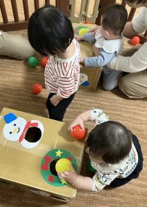 0歳児クラスはボール落としもしました。
